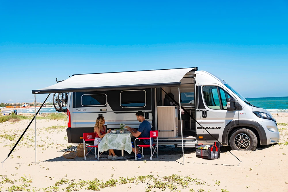 The Fiamma Tie Down S allows for solid anchoring of the Fiamma motorhome and caravan awnings by sliding directly into the front leading bar of the awning. The Fiamma Tie Down S may also be used with any Fiamma Privacy Room from version 2009, by way of buckle that attached to the Privacy side panel.